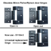 90mm black hinge suits Rylock & Fisher open out french door. Used for timber and aluminum doors, with aluminum frames. Hinged is made from extruded aluminum. Letter O on the back blade, is an identifying mark.