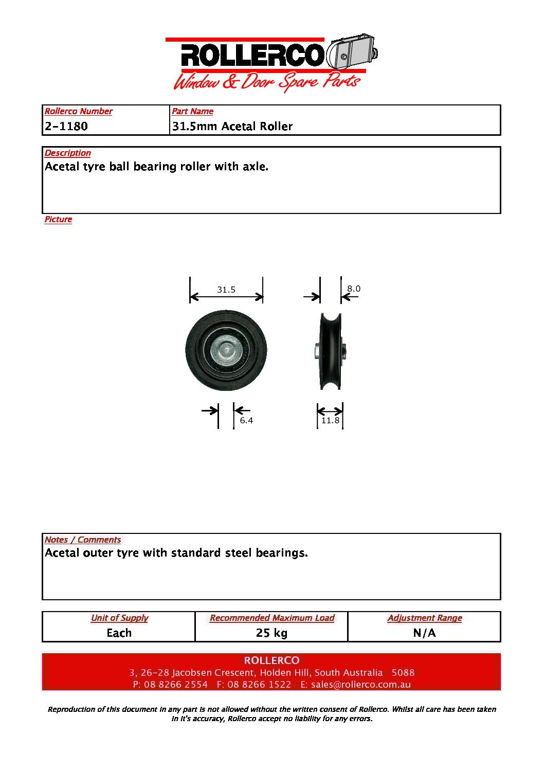 30mm nylon roller with 6.3mm x 11.9mm axle with stainless steel bearings. *capable of up to 50kg*