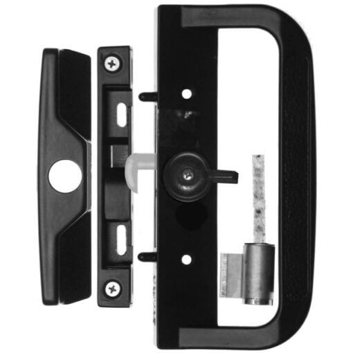Sliding glass door handle set includes outer pull with cylinder hole, cylinder and striker.