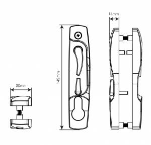 Sliding barrier/security screen door lock with internal snub function. Suits industry standard 160mm cut out in edge of door.